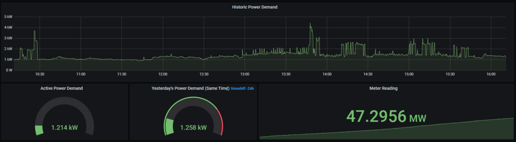 My favorite part of this dashboard is the power data. Using a Smart Utility Meter connected to our PG&E meter, I was able to set up a data feed with point-in-time power meter readings. I had to write a little Python daemon to receive the regularly-submitted reports from the meter and push them to my InfluxDB instance, but once this was up and running, it’s been pretty solid! … other than one little bug with units that sometimes reported a power consumption of 1 MW or more – but once that got squashed, everything’s looked very reasonable.